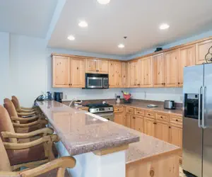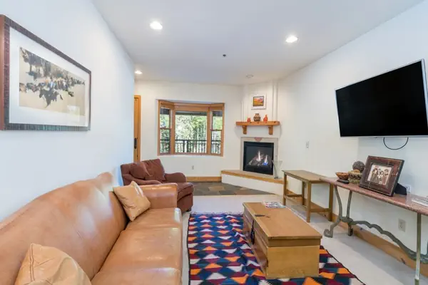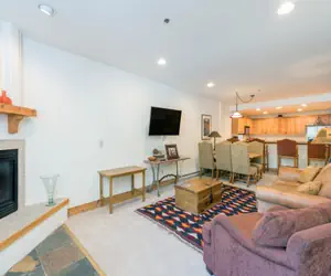Enter this condo on the fitness room level (first floor) and walk into the open dining area with seating for six guests and living room with a gas fireplace, with mountain views and a queen sleeper sofa. The sofa bed has a built-in air-mattress topper as a mattress. The living room is open to the kitchen with granite countertops and a breakfast bar with seating.