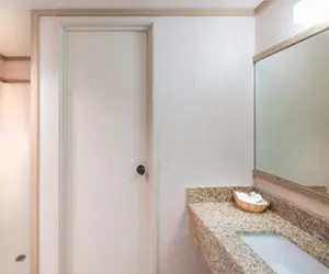 This hotel room has a king bed that can be split into two twins if desired. The room has a flat-screen TV with satellite, mini-fridge, small microwave, fan and humidifier. The private bathroom has a shower (no tub) and hairdryer.