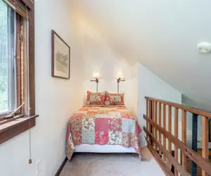 Upstairs, there is a queen bed and a full bed in the loft with a balcony that has river views.