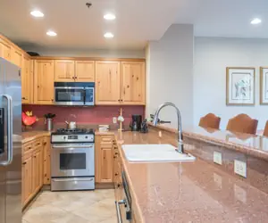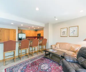 Enter this condo on the lobby level (third floor) and walk into the open dining area with seating for six guests and living room with a gas fireplace, balcony facing the mountainside (forest view) and queen sleeper sofa. Flat screen TV/DVD in living room. The living room is open to the kitchen with granite countertops and a breakfast bar with seating.