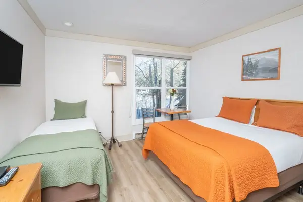 This is a hotel room with kitchenette (mini-fridge, microwave, two-burner stovetop, coffee maker and toaster) at the Mountainside Inn. This room has a queen bed and a twin bed and private bath with a shower (no tub).