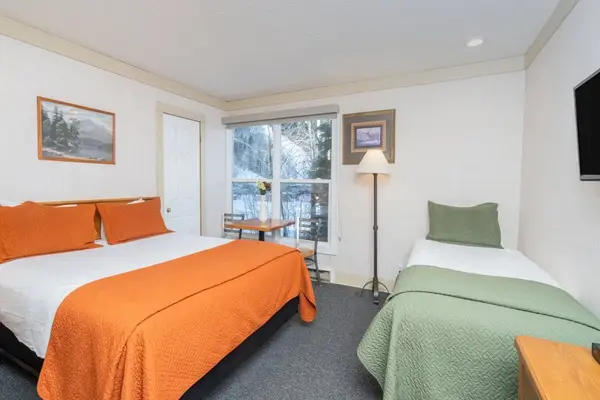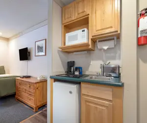 This is a hotel room with kitchenette (mini-fridge, microwave, two-burner stovetop, coffee maker and toaster) at the Mountainside Inn. This room has a queen bed and a twin bed and private bath with shower only (no tub).