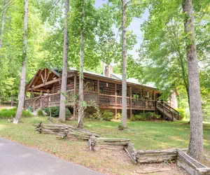 Outside, the wraparound covered porch/deck spans three sides of the cabin, offering abundant space for rocking chairs, swings, and seating. The unique setting is enhanced by mature landscaping and hardwood trees. A convenient laundry room is accessible, and the wraparound driveway provides easy unloading for trailers. You'll find no steep roads here, ensuring easy access for all guests.