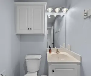 Upstairs, you’ll find two bedrooms, each furnished with a cozy queen bed. The full bathroom is conveniently located near both bedrooms, while the half-bath downstairs adds extra convenience for guests.