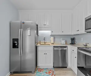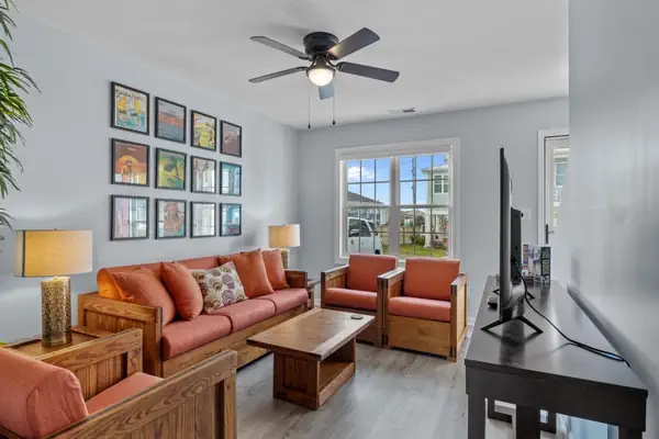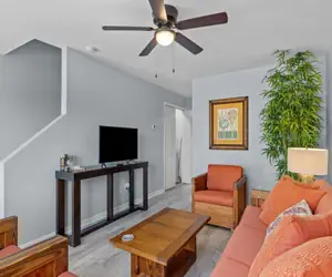 The first floor welcomes you with a living area designed for comfort and convenience. Unwind in the living room and enjoy a movie night after a day at the beach. The fully equipped kitchen features sleek stainless steel appliances, and all the essentials for preparing anything from quick snacks to family dinners. Just off the kitchen area is an outdoor patio that offers a perfect spot for morning coffee or reading a book, with a community charcoal grill nearby for casual cookouts.