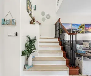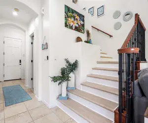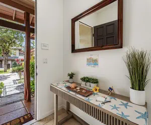 The huge fully stocked kitchen has everything you need to prepare your meals to enjoy in the lovely dining room or out on the lanai relaxing in the fresh breezes of paradise. There is a half bathroom downstairs for your convenience as well. The living room comes loaded with comfortable furniture perfect for relaxing and a brand new big screen Smart TV perfect for that family movie night.