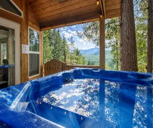 Das Tree Haus is a cozy 450-square-foot treetop cabin perched high above the Wenatchee River in the peaceful community of Chiwawa River Pines. Surrounded by towering ponderosa pines and facing the dramatic ridgeline of Icicle Ridge, this intimate retreat is designed with couples in mind. With a private hot tub, expansive wraparound deck, and propane firepit under the stars, it's a secluded sanctuary for two.