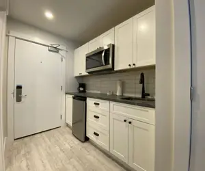 This unit will sleep up to four people in a comfy queen bed and sleeper sofa. However, please note that this is a hotel-room style condo featuring one room and bathroom. There is no kitchen.