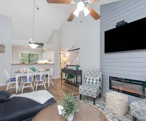 The open living area is warm and inviting, featuring a faux fireplace ️ and direct access to the private back deck. This space flows seamlessly into the dining area, which offers seating for six, making it perfect for shared meals or game nights.