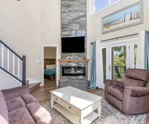 Step into a dramatic living room with soaring ceilings, a striking floor‑to‑ceiling fireplace, and cozy furnishings, including an electric reclining sofa and club chairs nestled in a charming bay window. The adjoining screened porch offers serene views and a table for four—perfect for morning coffee or alfresco dining.