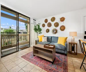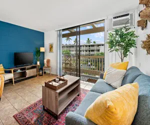 Upon entry, you have an open layout of the living area, kitchen, and lanai. The living room has a queen-sized pull-out sofa and a flat-screen smart television for convenience. Enjoy the island-style themed Hala hat wall and fun pops of color.