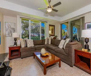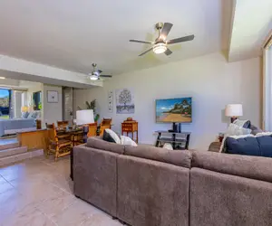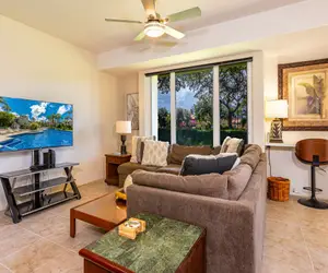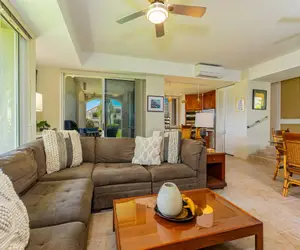 You will be welcomed by the open and inviting living space. Kick up your feet and relax after a fun-filled day on Maui. Complete with a large sectional, flat-screen TV, ceiling fan, and AC in the living room and both bedrooms. The spacious covered lanai with a dining table allow for relaxing evenings while you kick back and enjoy the views. Relax poolside or enjoy the Jacuzzi after the sun sets and take in the beauty of the brilliant Maui skies.