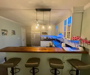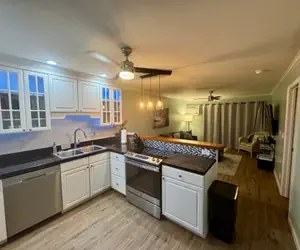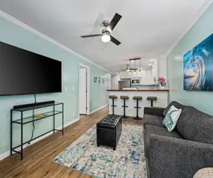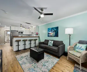 The living area is open concept with a great flow to allow for conversation from the kitchen to the living areas through to the lanai. The kitchen is fully stocked with all the gadgets any at-home chef needs. Enjoy dining at the bar or outside al fresco style on the lanai. The living area has a large 65'' flat-screen smart television, and there is a window air conditioning unit. There are ceiling fans in every room to keep the space comfortable during hot Hawaiian days.