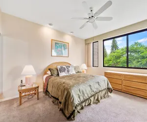 The primary suite has a California king bed and an en-suite bathroom with double vanity, a soaking tub, and a walk-in shower. A large closet as well as a chested drawer. Enjoy your ocean view and private lanai access.