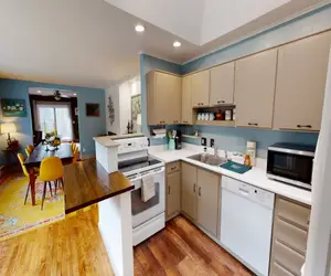The home's thoughtful layout includes three main-level bedrooms, each with a queen bed and its own smart TV, while the primary suite adds a private en-suite bath for extra comfort. Downstairs, the fourth bedroom features two twin beds and an attached full bath — ideal for kids or friends. The lower-level family room offers more space to spread out, complete with two sofas (one a sleeper), a 70-inch smart TV, and a shuffleboard table for friendly competition.