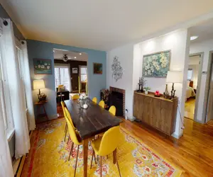 Inside, you'll find a beautifully curated home filled with warmth and character. The main level features a bright, open kitchen fully equipped for home-cooked meals, a dining area framed by large picture windows, and a cozy wood-burning fireplace that sets the mood for memorable evenings together. Just beyond, the living room offers two plush sofas, a 55-inch smart TV, a writing desk, and a charming reading nook — the perfect spot to unwind after a day outdoors.