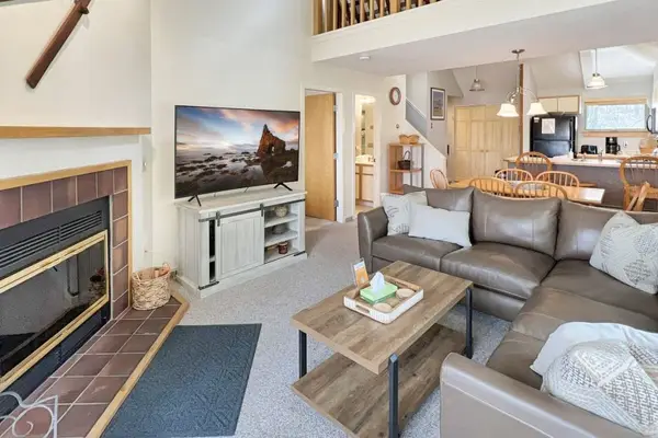 Inside, you'll find a bright, open-concept living area with vaulted ceilings, a warm wood-burning fireplace, and a fully equipped kitchen with a dining space perfect for gathering after a day outdoors. The main level also features a large private Jacuzzi tub — the perfect spot to unwind and recharge.