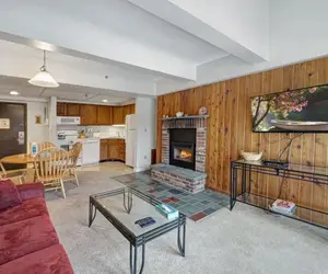 Inside, the open living area features a plush sleeper sofa, knotty pine accent wall, large mounted TV, and wide sliding doors that lead to one of the more private balconies in the building—ideal for enjoying fresh air and seasonal mountain views. The adjacent dining area offers a cozy space to gather for meals or morning coffee.