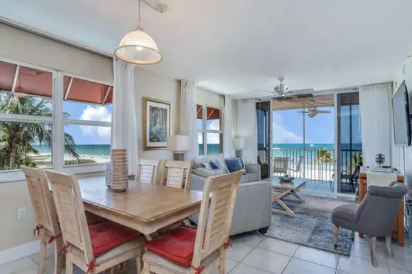 Enjoy your morning coffee with a view in Estero Island Beach Villas! This 2 bedroom, 2 bathroom, open concept condo is located on the popular northern tip of the island. Immediately walking through the front door, you will become mesmerized by the picturesque views coming from almost every angle of the Gulf waters, beach, and pool area!