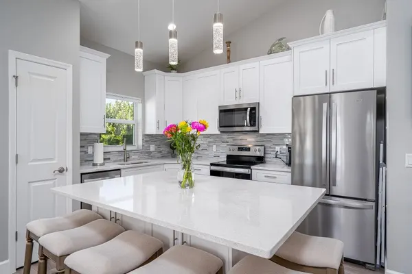 Enter this vacation home via steps to an open, nicely furnished, and covered front deck, then through the front door into the open-plan living, dining, and kitchen areas with volume ceilings. There is luxury vinyl tile flooring throughout. The kitchen is a chef's delight and has a pantry with plenty of cabinets and quartz counter space with tile backsplash. Appliances are all stainless steel and include a dishwasher, glass-top five-burner range with self-cleaning oven, built-in above-range microwave oven, and refrigerator/freezer with two refrigerator doors and pull-out freezer drawer with ice-maker. A water dispenser is located inside the refrigerator. There is a double stainless steel sink with a disposal. A large quartz-top island has cabinets and drawers on the kitchen side with six padded bar stools on the dining and living area side. Everything is available to prepare full-course meals if so desired. The laundry room with a full-size washer and dryer is just behind the kitchen. The adjacent dining area has a table seating six, which flows nicely into the living area with a sleeper sofa with end tables and lamps, a matching loveseat, and a coffee table on an area rug. Opposite the seating area is a credenza with a large wall-mounted flat-screen TV above.