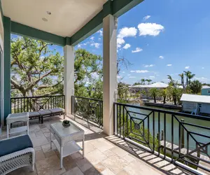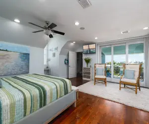 The third level has two guest bedrooms and a bath toward the front of the home, as well as a second master suite with an en suite bath along the rear. Both guest bedrooms are extensively and tastefully furnished. One has two single beds and a wall-mounted flat-screen TV. The other guest room is larger and has a king-size bed and sitting area, a wall-mounted flat-screen TV and the en suite bath can be accessed either from the bedroom or the foyer area. It has a nicely tiled combination tub/shower, commode, and vanity with a lavatory and storage space beneath. The main master suite on this level has a king-size bed with nightstands and lamps, a wall-mounted flat-screen TV, a sitting area with two chairs on an area rug, and sliding glass doors that go out to a screened-in and covered balcony overlooking the rear of the house that's furnished with four chairs and a cocktail table. There is a walk-in closet with a spiral staircase up to the fourth-level cupola where there is an enclosed and air-conditioned 4-chair sitting room. The amazing 360-degree view from here includes the back bay, the Key West Express terminal, the canal, the Gulf of Mexico, and Sanibel Island. The en suite bath has a vanity with dual lavatories and storage space beneath, a swivel full-length mirror, a commode, and a nicely tiled walk-in shower with a glass door and glass wall.