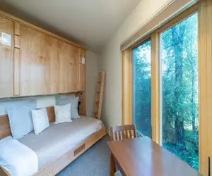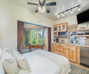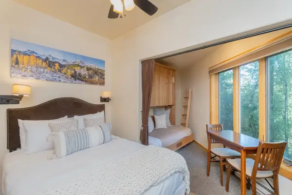 Stylish and affordable, this ground-floor condo at the Viking Lodge in the town of Telluride is a cozy and compact home base for your winter or summer adventures. The large window provides natural light in this well-appointed condo that sleeps 4 (2 adults/2 children) with a queen bed and bunk beds. If you don't need the bunk beds, fold up the top bunk and enjoy the lower bunk as a sitting/living area. The kitchenette features a mini-fridge, cooktop, sink, toaster, and coffee maker for your convenience. A sitting area near the door, updated bathroom, and a storage closet round out this affordable studio condo.