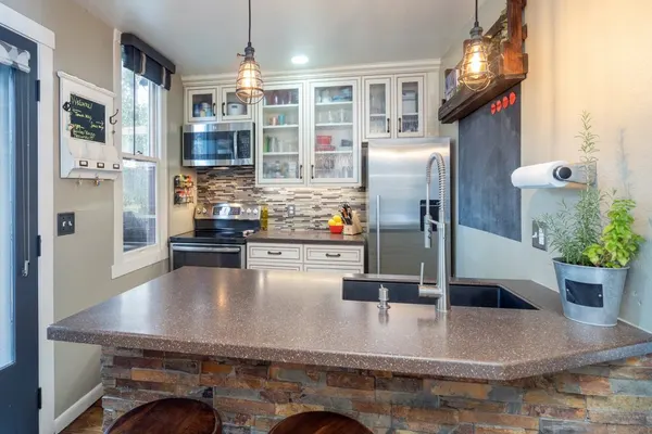 On the main level, the cozy kitchen and living room are filled with natural light, especially in the charming breakfast nook beneath the big picture windows. The fully equipped kitchen has everything you need—refrigerator, stove, microwave, and a small dishwasher—so you can feel at home whether you're making coffee or a full meal. Just outside, the private deck overlooking Cornet Creek is the perfect place to enjoy a post-hike snack, sip a glass of wine, or simply listen to the water before heading out for dinner. The living room offers a comfortable sleeper sofa and a large flat-screen TV for relaxing nights in.
