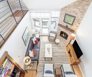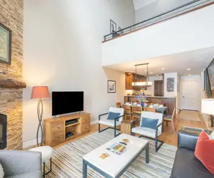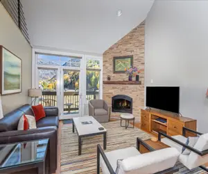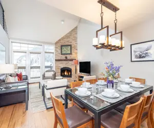 Rich wood tones and modern accents are the perfect mix for your mountain getaway. The vaulted ceilings create an open feeling and sky lights and picture windows throughout let in tons of natural light. The living area overlooks lift 7 in the winter, has amazing views of fall colors, and in summer enjoy stunning mountain views and the open space around lift 7. Anchored by the stone-faced gas fireplace, the living room offers ample seating for your party and a flat screen TV for your down time. Open to the kitchen which has all of the space and appliances you need for the comfort and convenience of a home cooked meal in your vacation rental. There's room for everyone to enjoy a snack or a meal between the breakfast bar and dining table for six.