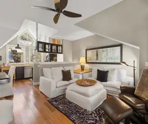 Enter the home and Telluride relaxation. The entrance has a closet where you can stash your outdoor gear. The two guest rooms are on this floor on either side of the hallway and feature carpeted floors. The room to your right is the first guest room and boasts a queen bed, two night tables, a dresser, and closet for all your things. The room faces the street for a view of the neighborhood. To the left is the second guest room featuring two twin beds with shared night table between. Perfect for kids to share, there is a closet that provides storage for everything you brought with you. The room faces the complex courtyard where you can watch the goings-on of the community. At the end of the hall is the shared bathroom that features a tub/shower combo and single-sink vanity.