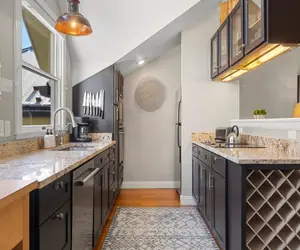 Up the stairs, you'll find the main living level with open kitchen, living, and dining space. Wood flooring runs throughout and hosts comfortable and stylish furnishings in each space. Sink into the comfortable chair, couch, or love seat and warm yourself by the fire or watch your favorite movie or TV show together on the wall-mounted flat screen TV. When it's mealtime or snack time, turn to the fully equipped kitchen. The galley-style space features stainless steel appliances including wall oven and electric cook top. Granite counters offer plenty of prep space, and cupboards hold everything you'll need to prepare and serve a home-cooked meal. There is even a wine rack. Plenty of windows allow for natural light to stream in to the space. Enjoy the meal at the large rectangular dining table with seating for six. There is also a work area tucked away featuring a desk and chair where you can check in with friends and family who couldn't make the trip. There is a half bath off the dining area, as well as a stacked washer and dryer for your convenience.