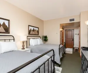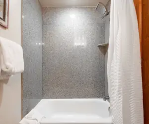 Relax in a remodeled one bedroom with two queen beds, one bathroom, mini fridge, microwave, dresser, flat screen HD television, nightstand with lamp, full bath/shower with granite countertops and granite surround.