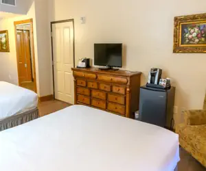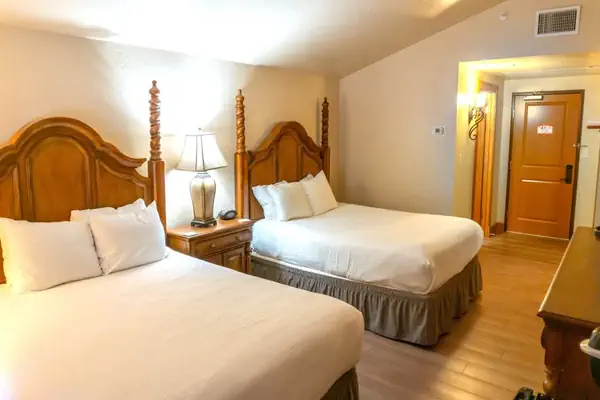 Relax in a remodeled one bedroom with two queen beds, one bathroom, mini fridge, microwave, dresser, flat screen HD television, nightstand with lamp, full bath/shower with granite countertops and granite surround.