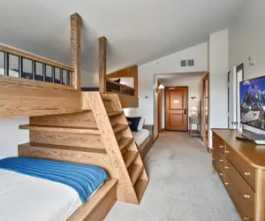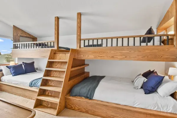Unique bunk bed set-up: with 2 queen beds on bottom, and 2 twin beds on top, Sleeps up to 6; dresser, flat screen HD television, full bath/shower with granite countertops and granite surround.