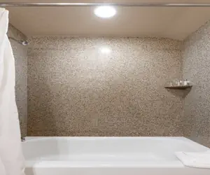 Relax in a remodeled one bedroom with two queen beds, one bathroom, dresser, flat screen HD television, nightstand with lamp, full bath/shower with granite countertops and granite surround.