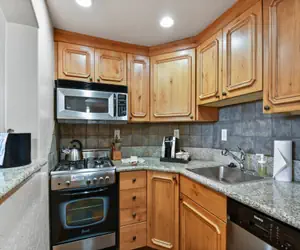 Upgraded features include beautiful natural stone slate floors and granite countertops. The bathroom includes granite surround, jetted tub & separate showers. The kitchen has stainless steel appliances and a unique European breakfast nook for dining near the living room. European handmade Swiss hardwood chairs, large crown molding & European inspired fireplaces for a relaxing and memorable experience.