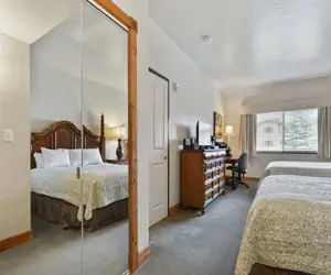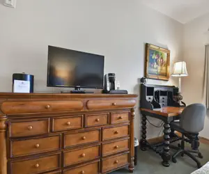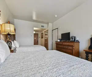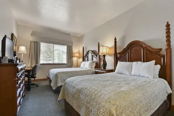 Double Queen (Sleeps 4): Includes 2 queen beds, dresser, flat screen HD television, desk, desk lamp & organizer, nightstand with lamp, full bath/shower with granite countertops and granite surround.