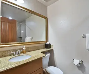 Relax in a remodeled one bedroom with two queen beds, one bathroom, dresser, flat screen HD television, nightstand with lamp, full bath/shower with granite countertops and granite surround.