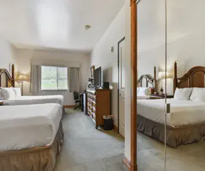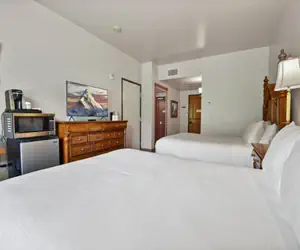 Relax in a remodeled one bedroom with two queen beds, one bathroom, mini fridge, microwave, dresser, Smart TV, nightstand with lamp, full bath/shower with granite countertops and granite surround.