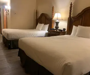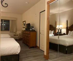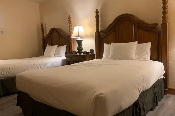 Relax in a remodeled one bedroom with two queen beds, one bathroom, mini fridge, microwave, dresser, flat screen HD television, nightstand with lamp, full bath/shower with granite countertops and granite surround.