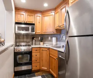 Upgraded features include beautiful natural stone slate floors and granite countertops. The bathroom includes granite surround, jetted tub & separate showers. The kitchen has stainless steel appliances and a unique European breakfast nook for dining near the living room. European handmade Swiss hardwood chairs, large crown molding & European inspired fireplaces for a relaxing and memorable experience.