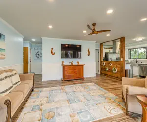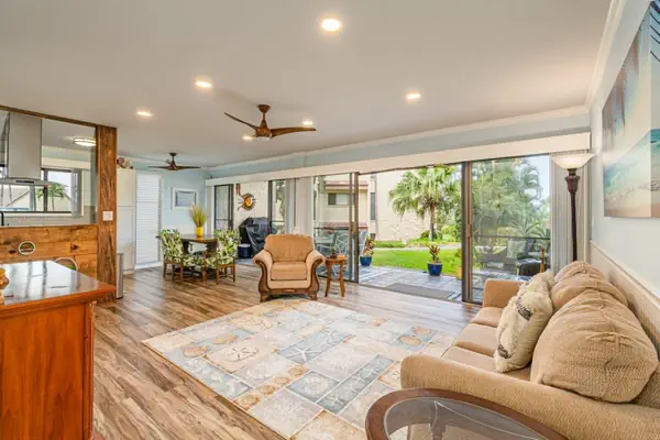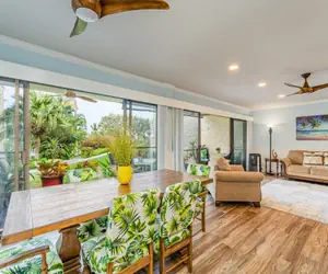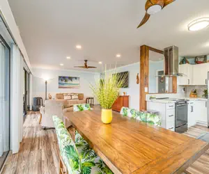 This two-bedroom, two-bathroom home has all one needs on a Hawaii vacation. The living area and dining room have an open layout that allows for a great place to relax. There is a large smart television in the living room to watch all your favorite shows and movies. Enjoy the sliding doors in both the living room and dining area.