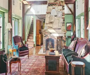 Inside, this expansive home features five bedrooms and four and a half bathrooms across two wings, blending classic architecture with modern comfort. The main level showcases radiant pine flooring, reclaimed barn board walls, and a stunning great room with high ceilings, exposed beams, and a floor-to-ceiling stone fireplace. The country-style kitchen comes fully equipped with modern appliances, while the library and den provide a cozy place to read, relax, or work remotely.