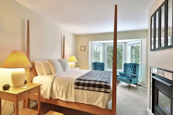 SECOND FLOOR - Blue Velvet Room #10: queen bed; two easy chairs; ensuite bathroom with jacuzzi tub and shower; gas fireplace; smart TV; mini-split AC (sleeps 4)
