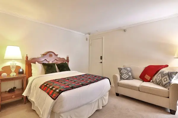 The Lace Room features a plush queen bed and a cozy sofa, providing ample space for up to two guests. The room also features a smart TV, perfect for relaxing after a day of exploring the nearby mountains.