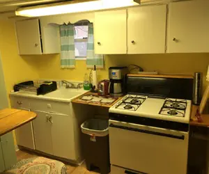 The kitchen features a full size refrigerator, full size gas stove/oven, and all the essentials for meals. It consists of 2 Bedroom and 1 Bath and is accurately described as a basement apartment, under a rustic beach cottage. It has it's own private entrance and parking. The windows are the smaller casement style, that contain 3 air conditioning units.