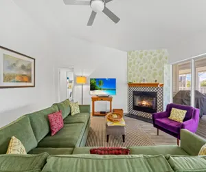 The open floor plan invites you to sit back and relax in the large living room with a large flat-screen TV with streaming video, a dining room, and a fully equipped kitchen with stainless steel appliances.