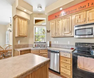 - The kitchen includes a full size refrigerator, stove, microwave, sink, dishwasher, granite countertops, center island, drip coffeemaker, a breakfast bar and fully equipped with everything you need.