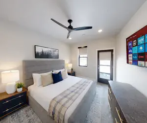 Elegant Bedrooms: The primary bedroom offers a king-sized bed and ensuite bathroom with a spacious shower. Additional bedrooms include a queen-sized bed and a twin over full bunk bed, sharing a modern and well-appointed bathroom.