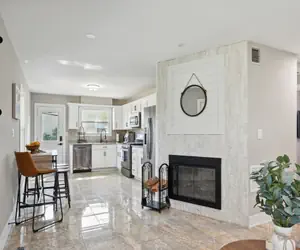 During colder months, the fireplace with built-in heat dissipater spreads warmth throughout the home, creating a cozy and inviting atmosphere.