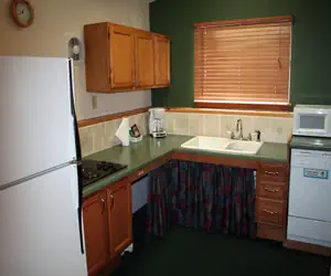 The River View Chalet Unit 11 features aspen log furniture and a full kitchen (minus oven) contributing to a cozy mountain escape.